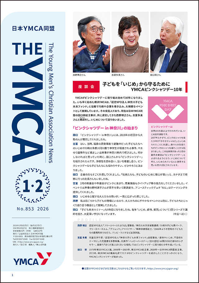 YMCAがピンクシャツデーに取り組み始めて10年になりました。いち早く始めた横浜YMCAは、「認定NPO法人 神奈川子ども未来ファンド」と協働で行政や企業を巻き込み、大規模なイベントとして展開しています。その発起人であり、現在は日本YMCA同盟の田口努総主事が、共に運営してきた西野博之さん、吉富多美さんと鼎談をし、いじめについて語り合いました。