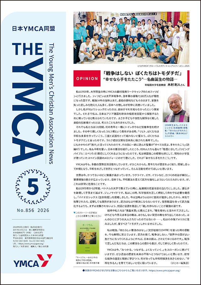 YMCAは今も、多数の国際交流活動をしています。ぜひこれからも、青年たちが歴史をよく知り、理解し合って仲間となり、平和をめざして世界とつながっていく。そんな活動を続けてほしいと思います。世界は今、かつてないほどに緊張が高まっています。ウクライナ、ガザ、イランなど、力づくの政治が横行し、軍備増強の動きが広まっています。日本でも、平和憲法を変えて武力を強化しようという人たちがいます。が、これは非常に危険なことです。