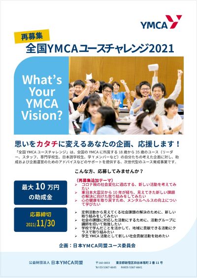 「全国YMCAユースチャレンジ」は、YMCAに所属する18歳から35歳のユース(リーダー、スタッフ、専門学校生、日本語学校生、学Yメンバーなど)の活動を助成するプログラムです。