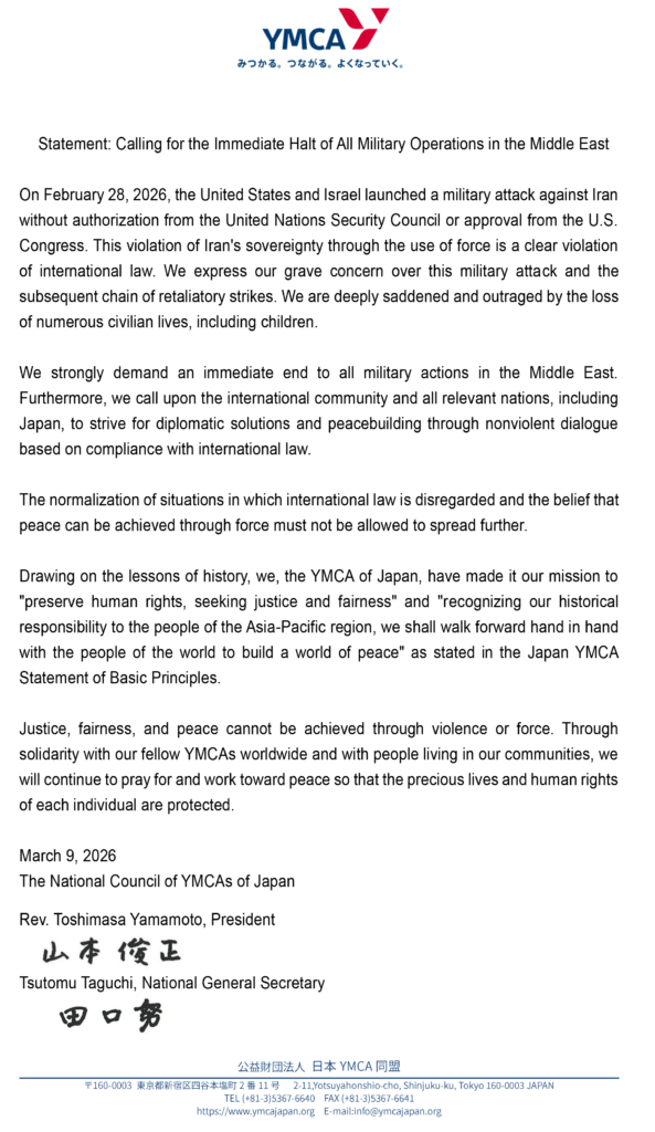 2026年2月28日、米国およびイスラエルによってイランに対して開始された軍事攻撃は、国連安全保障理事会の決議や米国議会の承認も受けておらず、武力によって主権を侵害する行為は、明白な国際法違反と言わざるを得ません。今回の軍事攻撃ならびにそれに続く報復攻撃の連鎖に対し、私たちは強い憂慮の念を表明します。すでに子どもたちを含む多数の一般市民が犠牲となっていることに深い悲しみと憤りを覚えます。
