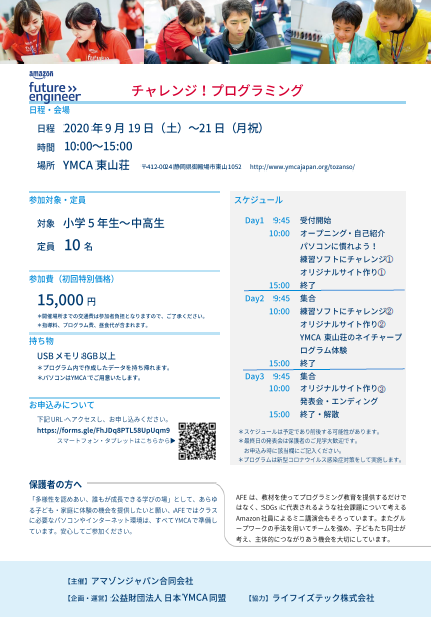 Amazon と YMCA、そして Life is Tech! の協力による小学校5年生から中高生を対象とした プログラミング体験教室がYMCA東山荘にやってきます!
