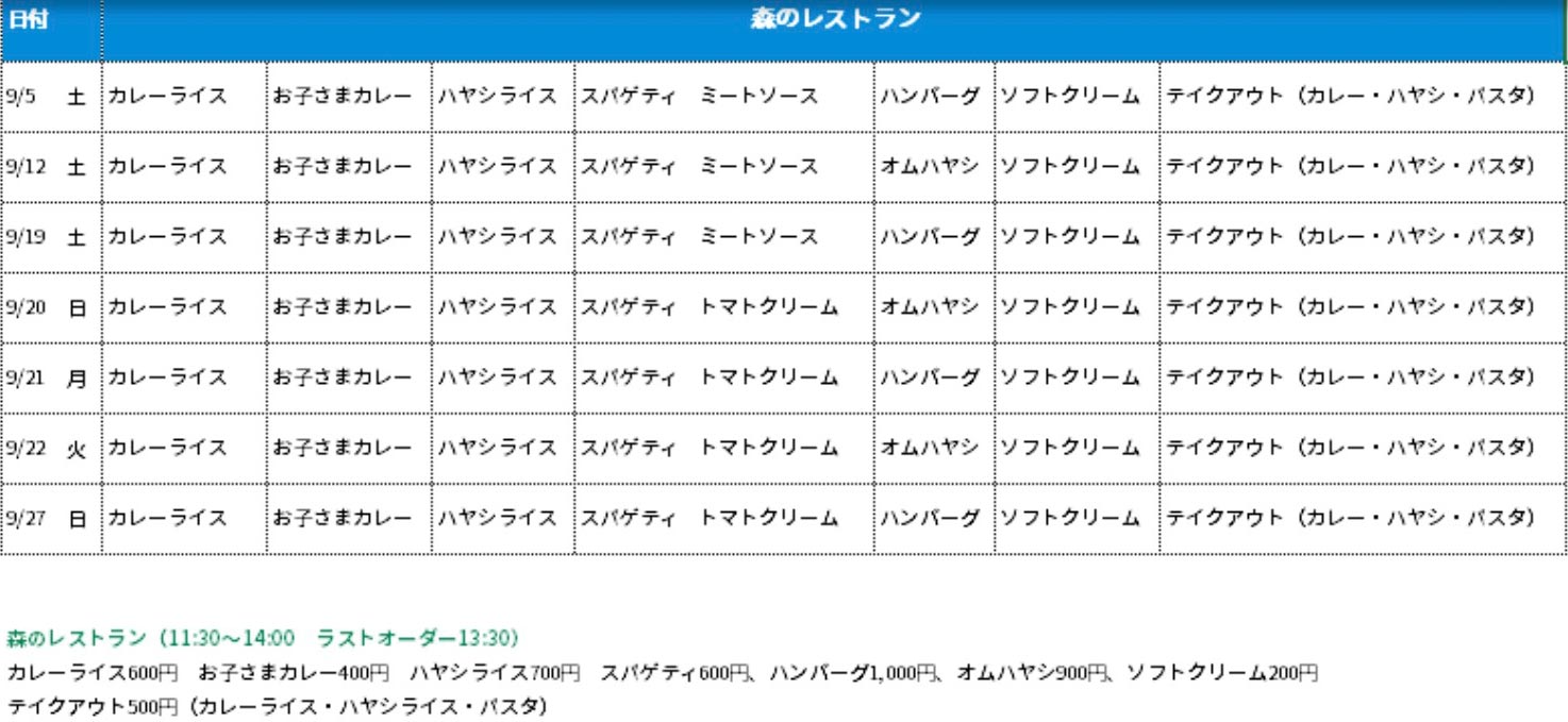 高原の風を感じながら森のレストランでゆったりとランチを召し上がってみませんか。この夏も多くの方にご利用いただきました。新メニューパスタは早速リピーターの方が多くお越しくださいました!今月はミートソース、トマトクリーム 600円でご用意いたします。甘口お子様カレーは400円でオレンジジュース付き、たくさん食べたいお友達は、で大人と同じ量で甘口もご用意できます(サラダをジュースに変更できます)。カレー、ハヤシライス、パスタは今月からテイクアウトもできるようになりました。老舗の本格的な味をご家庭でも召し上がっていただけます!ぜひご利用ください。